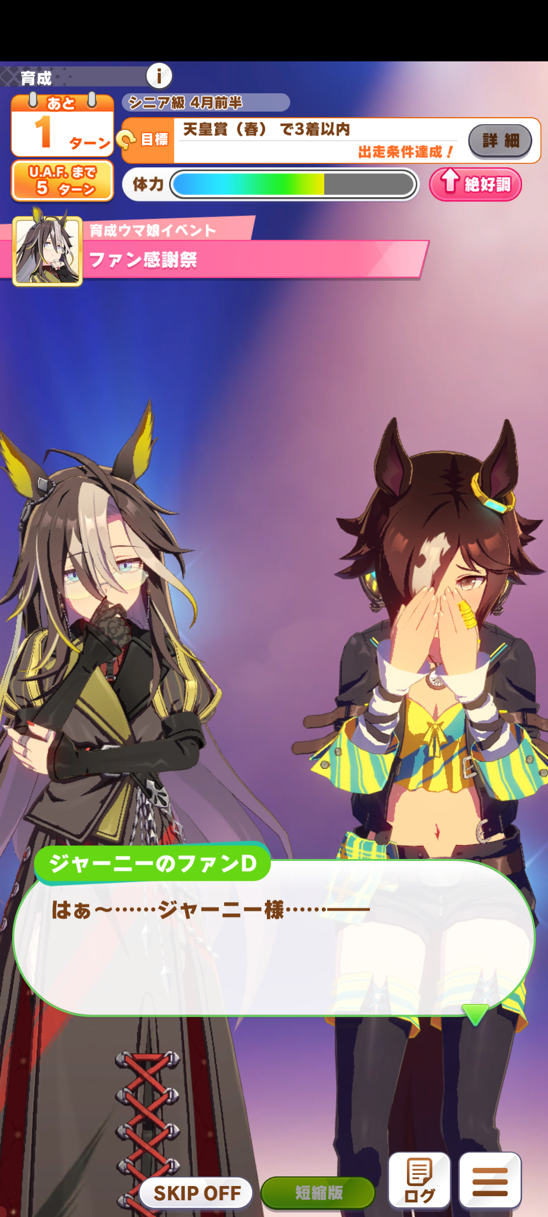 なんていうかむちゃくちゃステゴ族の長兄だった……。これは紛うことなきインテリヤ○ザ。静かだけど怖いし考えが読めない。ドリジャがこうなるんだ~~~って感じ。身内には優しいのもヤっぽい。両親とオルフェのことを愛し慈しみ、ゴルシやナカヤマとのじゃれ合う。ブエナ出てきたのもよかった。ブエブエしてた