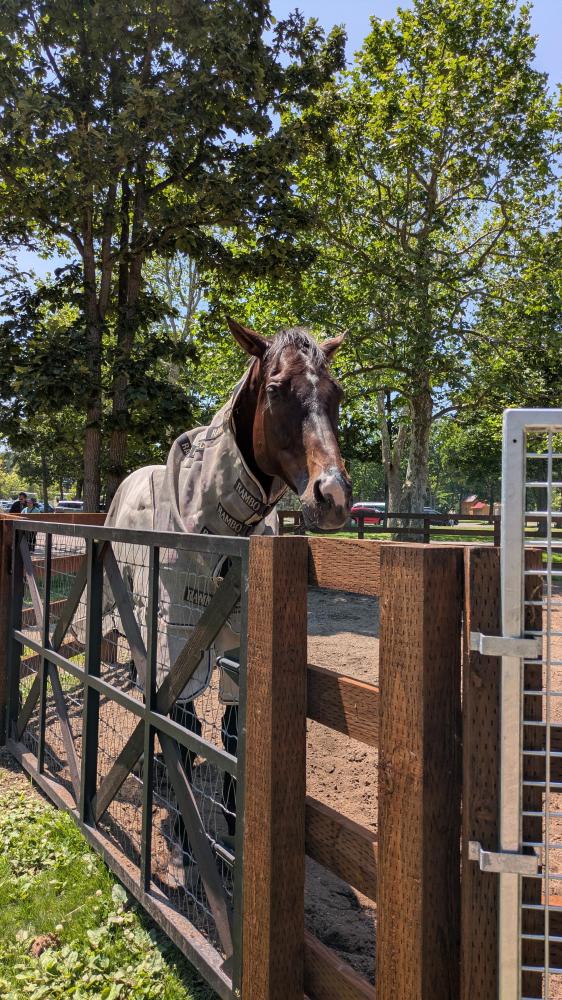 やっと会いに行けましたーーーかわいい。相棒のジョンが丁度収牧されていったのでひとり放牧されていました。こんなにかわいい……けどドン引きするくらい強い……(G1を10勝)