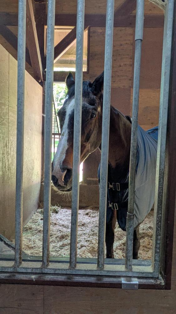 お元気そうで何よりです。会いに行った時はお顔上げててラッキー。暑いから厩舎で過ごすほうが多いかしらね。これからもお健やかに