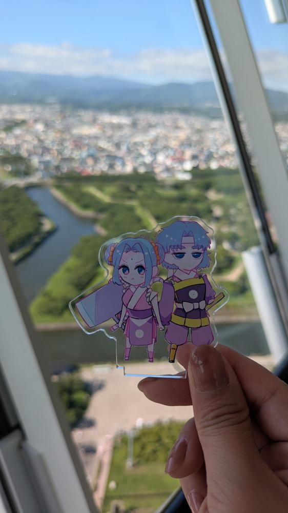 とやにこアクスタと五稜郭。飛行機から見れたのでタワー登らなくてもいいかも……と思ったのですが、より間近でみたほうがそりゃくっきりは見える