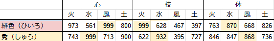 緋色は拳法家で当主(この↑の子の母)と異母姉弟で、火の女神様にご執心とか言っちゃうけっこう変わり者の調子のいい感じの子で、秀は父親から受け継いだ剣士を真摯に全うしてるわりとなんでもむずかしく考えがちの神経質な子……というイメージがある。つまり正反対(心ステも反対ぎみでした)