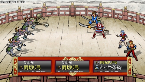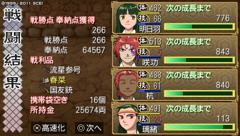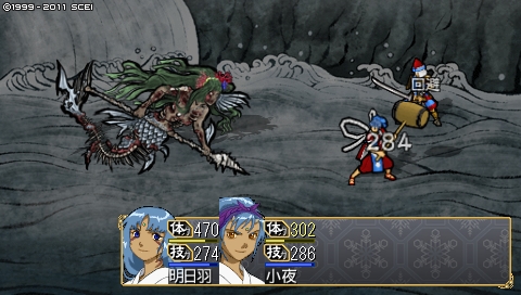 雨野家はわりとリセット常習だったのですが、この時なんでリセットしなかったかというと、歓喜の舞戦で竜神刀手に入った上に、その後も術が3つくらい(しかも陽炎、魂寄せという重要術)が手に入ってしまったから後に引けなかったンですね…
