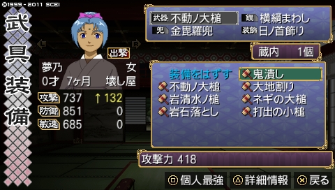 序盤は武器に苦労しました。真砂の太刀は拾えない、竜神刀も石猿田衛門で落ちずに解放。それでもなんとか真砂と竜神刀を拾って、陶くん(7代目)の時代までは竜神刀を愛用。なお8代目のきらりちゃんは美剣白鳳でした(めっちゃいいよね)