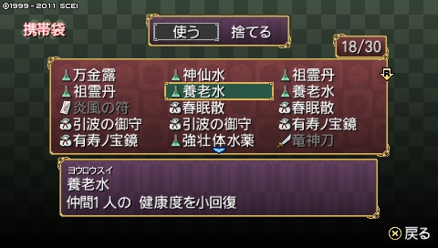 たしかこの時、初貴くんだけでなく杭も戦闘不能になってて、七光りの御玉で杭が復活→初貴の健康度回復は奥の院(まだ行ってない)デベソ像奥にある宝箱に養老水が入っていることに賭ける、という強行。いや凶行