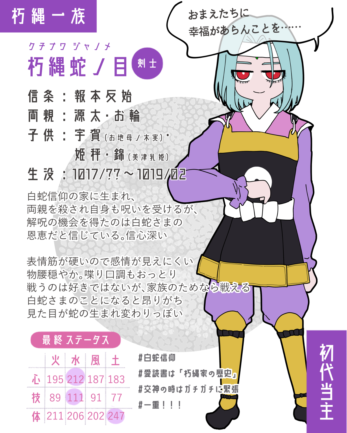 熱狂的な白蛇さま信者。呪いという最悪に対して使命と家族を得られたのは白蛇さまのもたらした幸福だと思っている。優しさ全振りな子煩悩