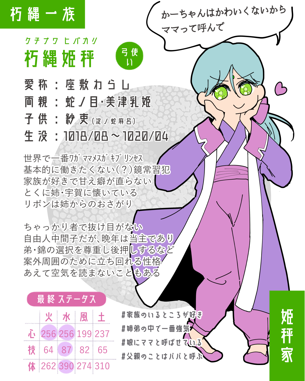 おうち大好き戦うのは嫌いな引きこもり体質のワガママ生意気クソガキ姫。中間子らしい自由人で思ったことは口にしていくタイプ。お姉ちゃん大好き。蛇は友だち