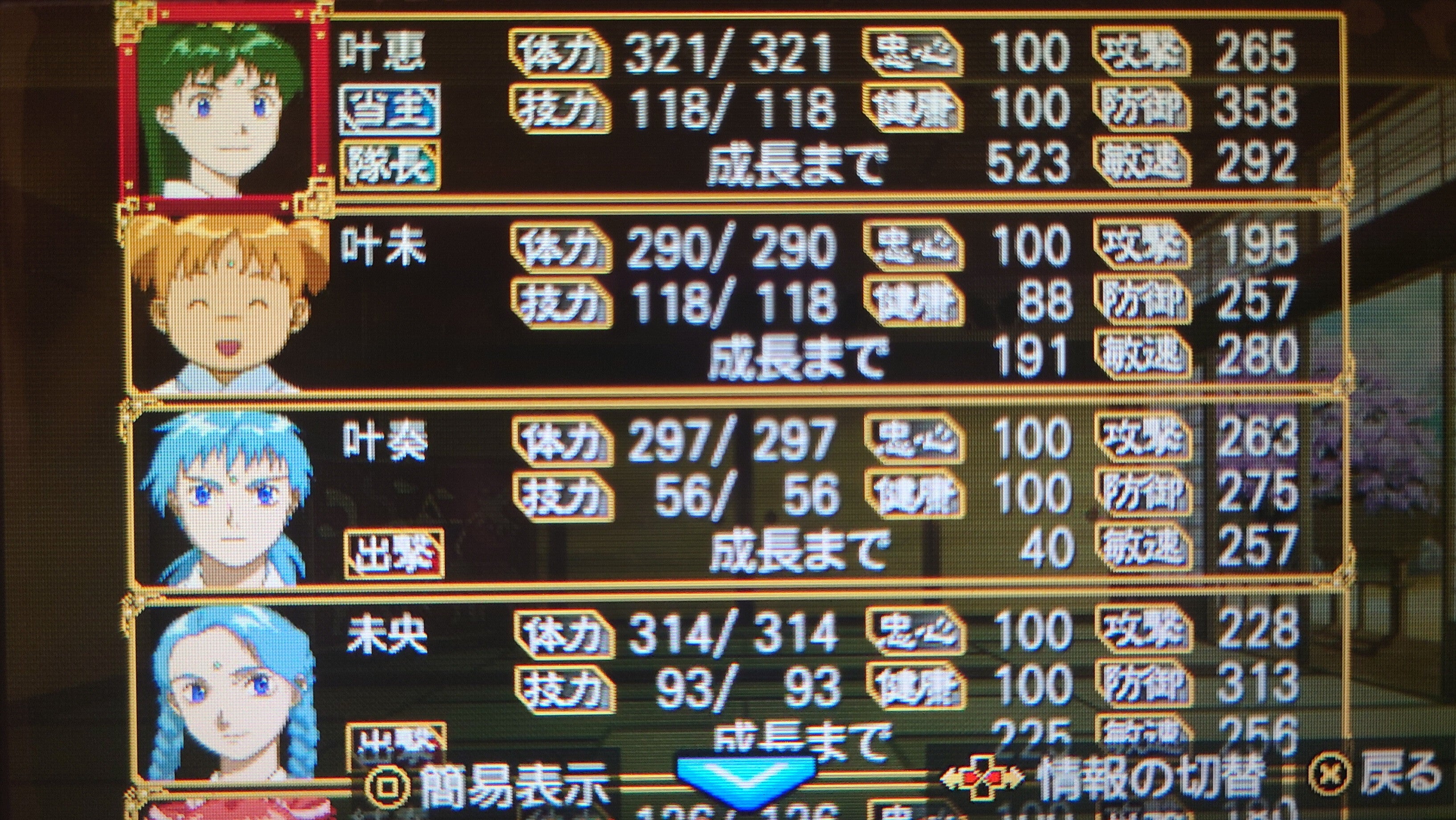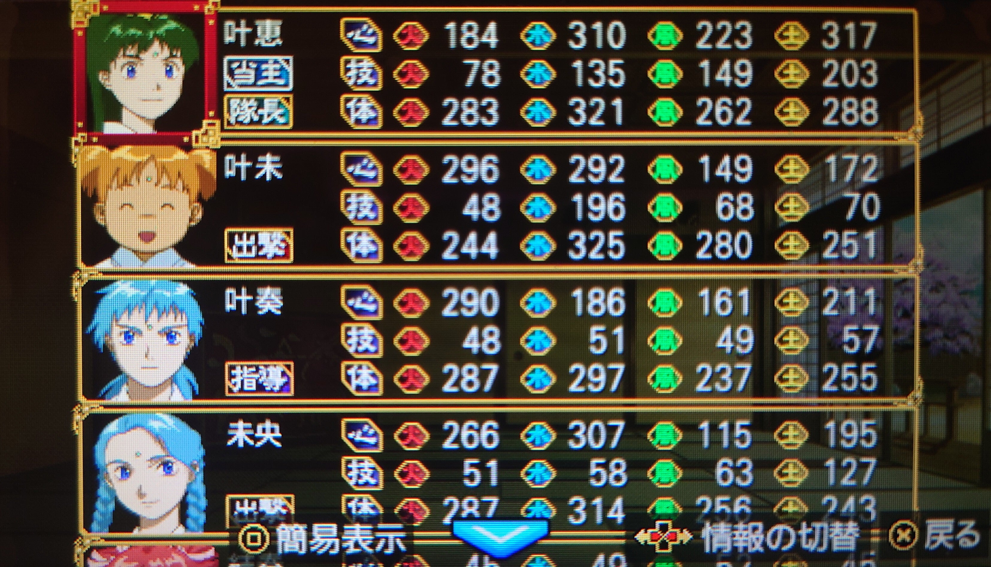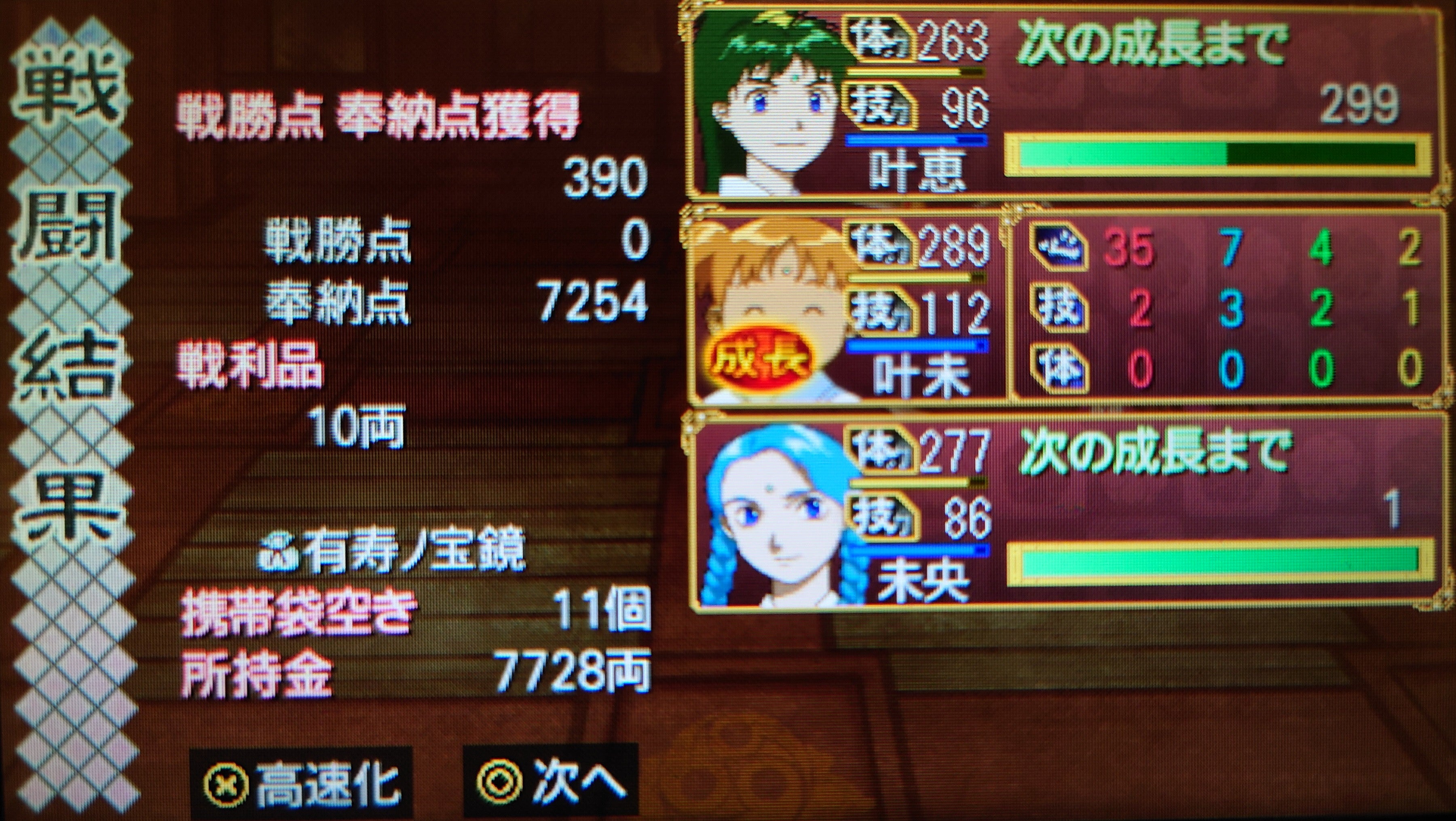 (槍の指南手に入れたのに全然槍使いにしないですね……?)拳の指南が欲しいのと経験値稼ぎに九重楼責めに向かいます。今月は当主芽恵ちゃん、叶奏くん、未央ちゃんの三人で出撃です。未央ちゃんも成長させたいしね