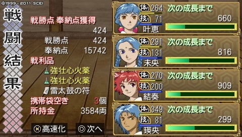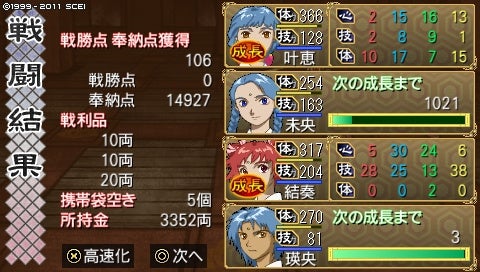 結構ラッキーだったと思います。雷落としとかまいたちをなんとか耐え抜き、三人回復、結奏ちゃんに武人を集める先方でなんとか勝利!