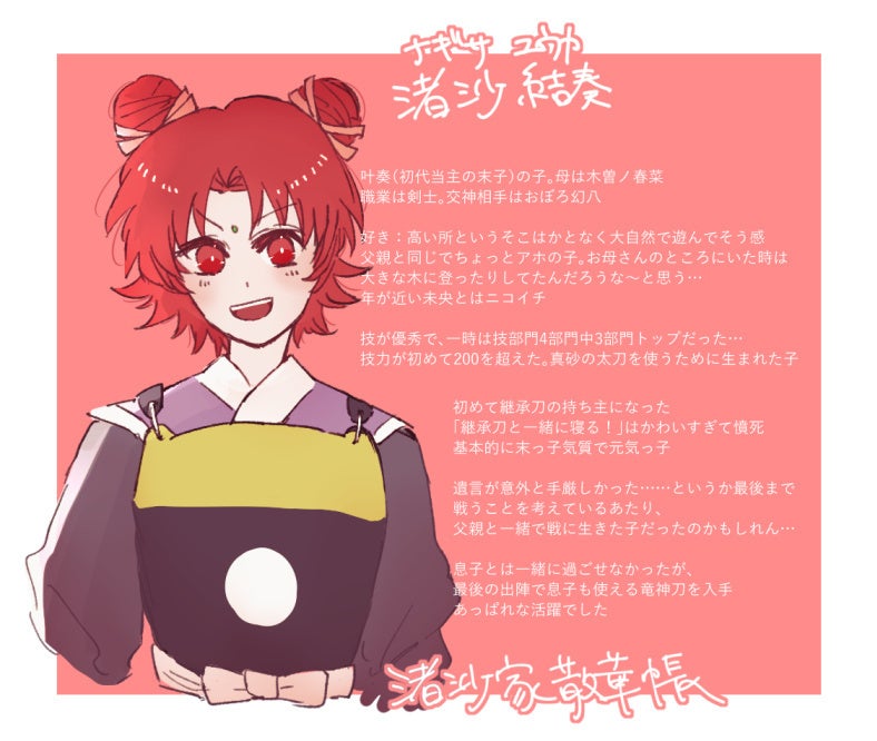 お父さんは叶奏くん。叶奏くんの口癖は「絶対に」。結奏ちゃんの好きは「高い所」。ちょっとアホっぽいラブリー親子やん……ついこの前も継承刀出来上がった時に「刀と一緒に寝る」とか言っちゃうし。かわいいやつでした