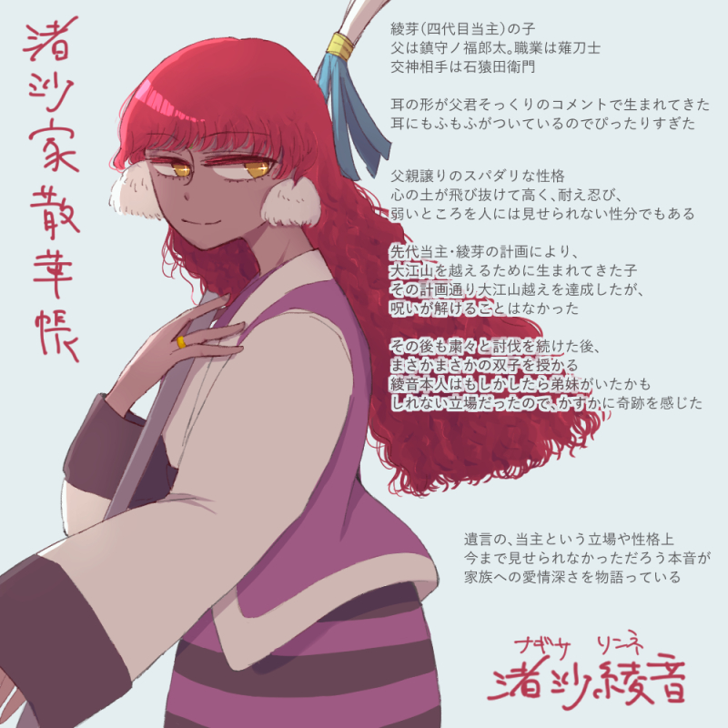 この子で大江山の朱点童子を倒すんだ!って生まれた時から決まっていた。プレイヤーはゲームストーリー知っているので、つらい役目をこの子に背負わせななければならないと生まれた時から分かっていました。綾音ちゃんは大江山越えもその後も精一杯やってくれたと思います