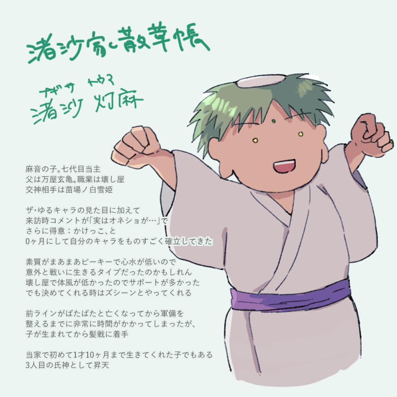 君のことゆるキャラチック(来訪時おねしょコメント、得意かけっこ、ビジュアル)に扱っていたんですけど、麻雀のできるゆるキャラ当主に……(属性過多)