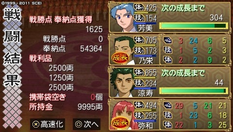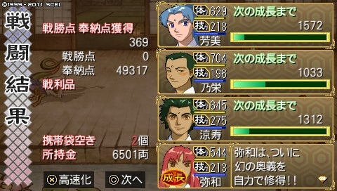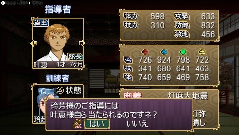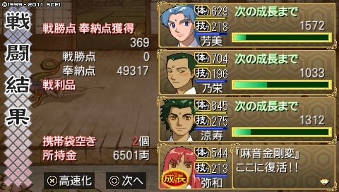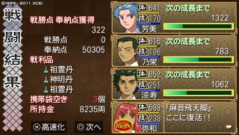 初陣にて奥義「麻音金剛変」と「麻音飛天脚」復活!いいね~もうこれさえ覚えておけば拳法家はね、最強ですから……。体力も順調に伸びています