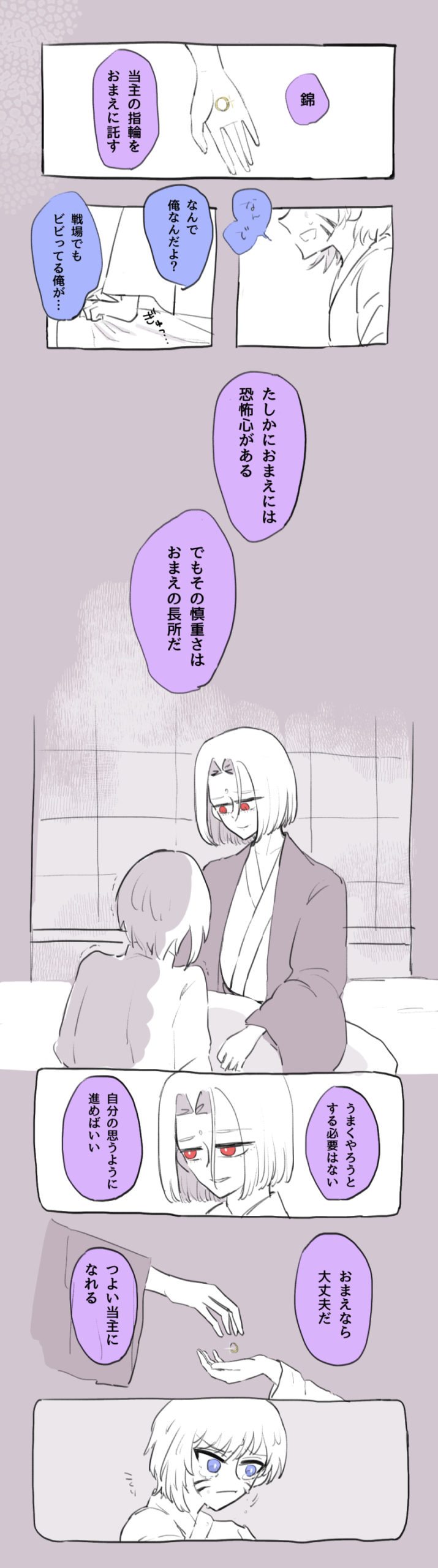 蛇ノ目の優しい父親感って本人の心水もそうなんだけど(最終的に心火を抜いて心ステの中では一番になりました)、宇賀ちゃんの放っておけない感もあってのことだなあと思う。子どもたちと過ごすことで育まれた父性