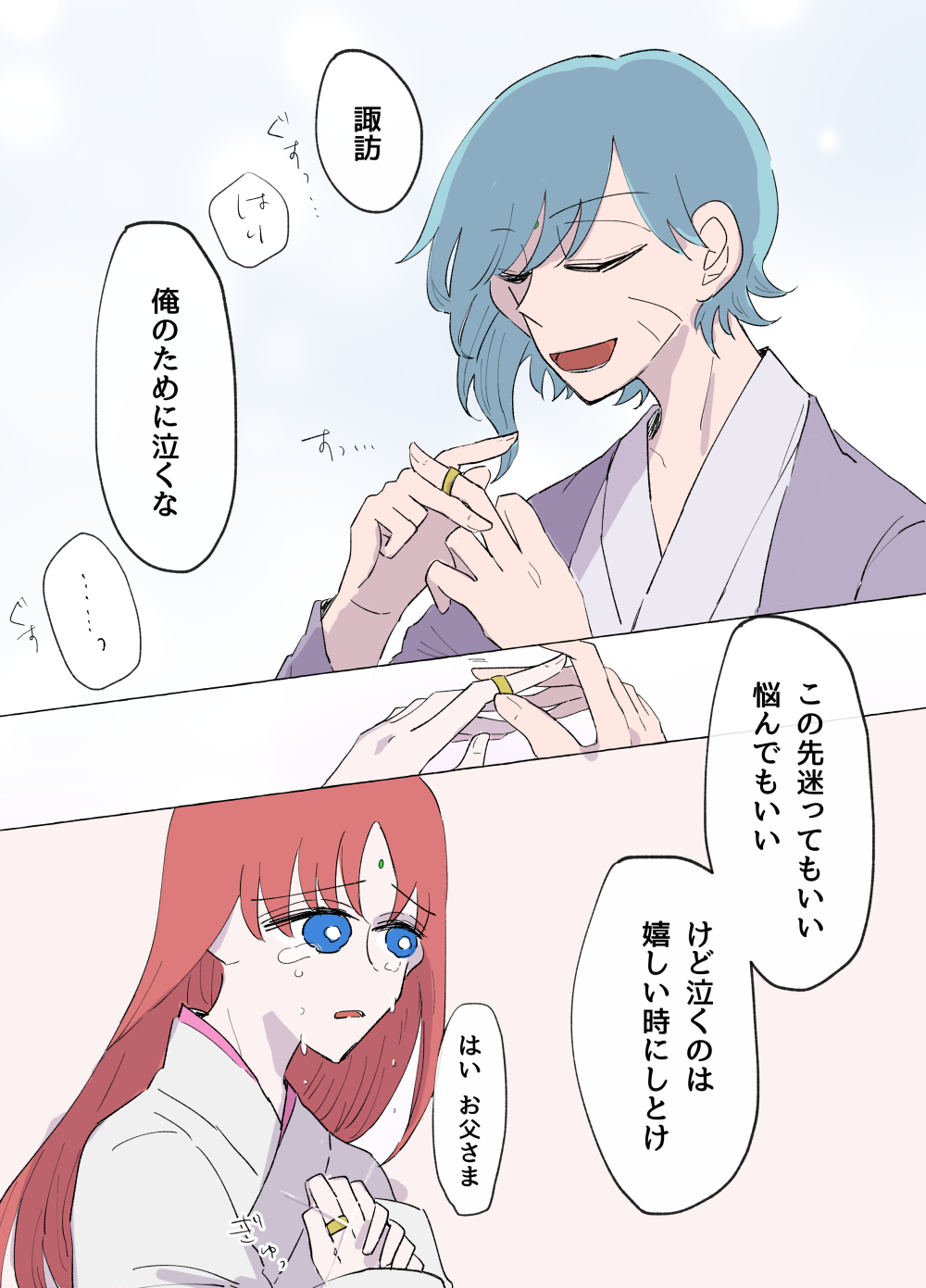 諏訪ちゃんから見ると、錦はめちゃくちゃ頼れる父親・当主なんですよね~~~退却準備とかしちゃってた錦がね~~。蛇ノ目や宇賀ちゃんや姫秤に支えられてここまで大きくなりました。諏訪ちゃんもたぶんそうです