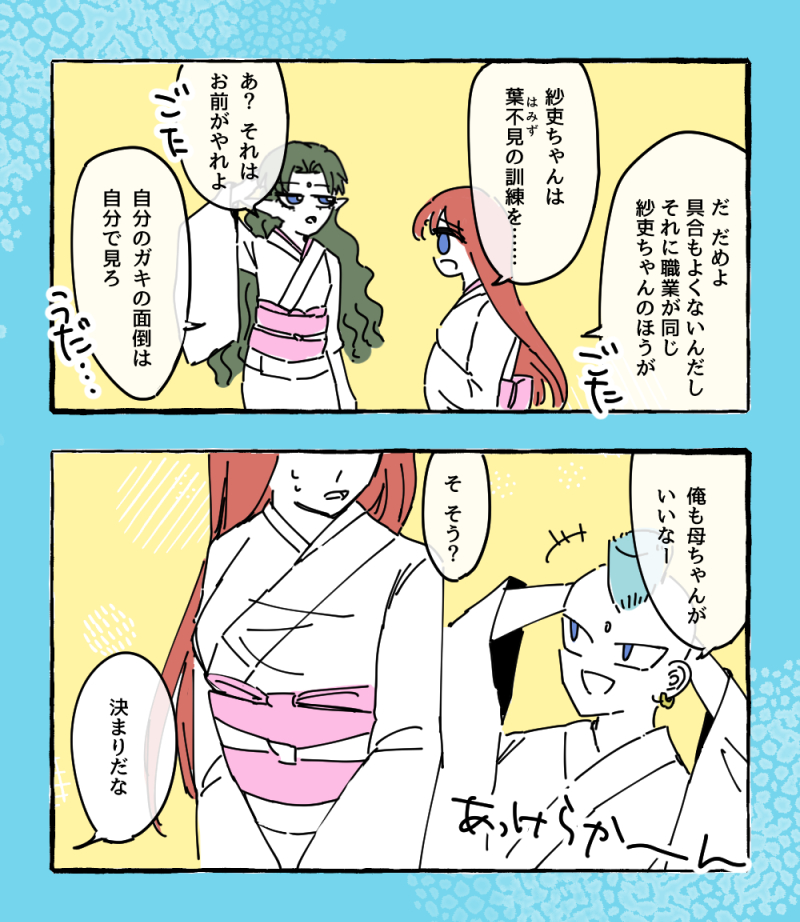 これで行きましょう!お母さんの諏訪ちゃんが留守番で葉不見くんの訓練! 紗吏ちゃんはラスト出陣で隊長! 武功を立てたいっていうのとは真逆のタイプだと思うんですけど、ラストバウトやってもらおう
