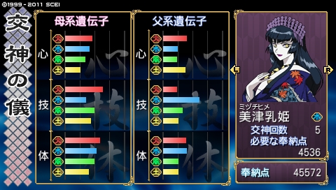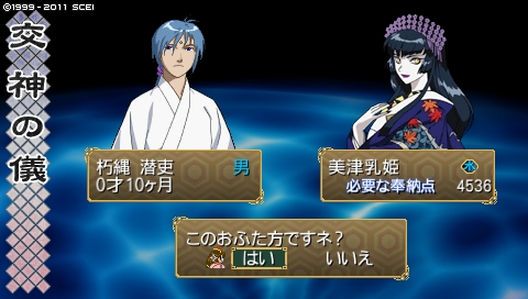 潜吏の交神です! 10ヶ月で早いけどね、11~12月は大江山攻めるからこのタイミングでやっておきたいなって……。潜吏は姫秤ラインでは初の男の子なので久しぶりに美津乳姫さまの素質が混ざることになりますね