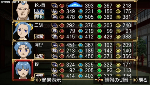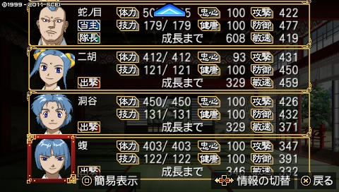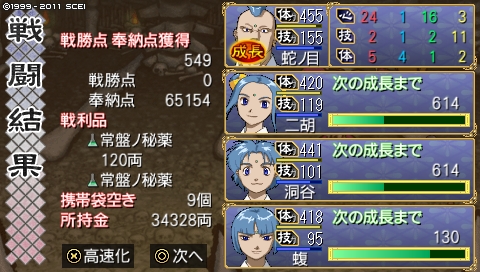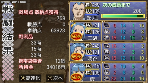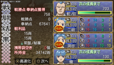 蝮ちゃん、初陣ですでに体火水400まで乗りました! もう主力ですね。がんがん行こう!あとは技風があ~伸びてほしいなぁ。胡蝶が君を待ってるよ……(今は功徳)。心は土以外均等な伸びですね。どこかで見たことある伸び(潜吏の奥のほうを見ながら)