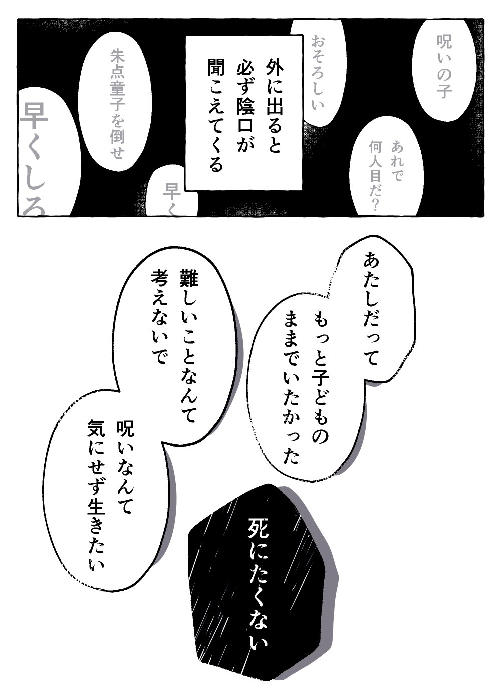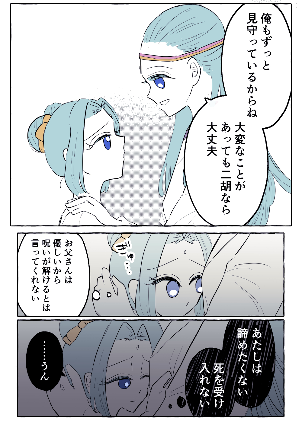 二胡ぴはまだどうして逸巳たちが「死を受け入れた」のか理解できていないです。二胡ぴは防御連発する(しかも相手を選ぶ)のもあって、家のため一族のためというよりは自分のために呪いを解きたい、生きたいと思っている。どっちの考えがいいとか悪いではないです。ただ二胡ぴはまだ他人の気持ちを慮る余裕はないかなと思います