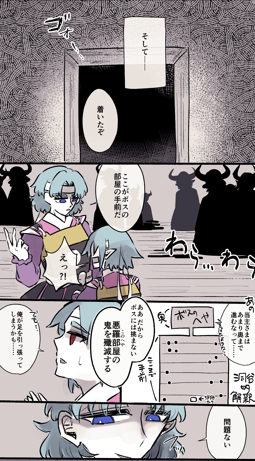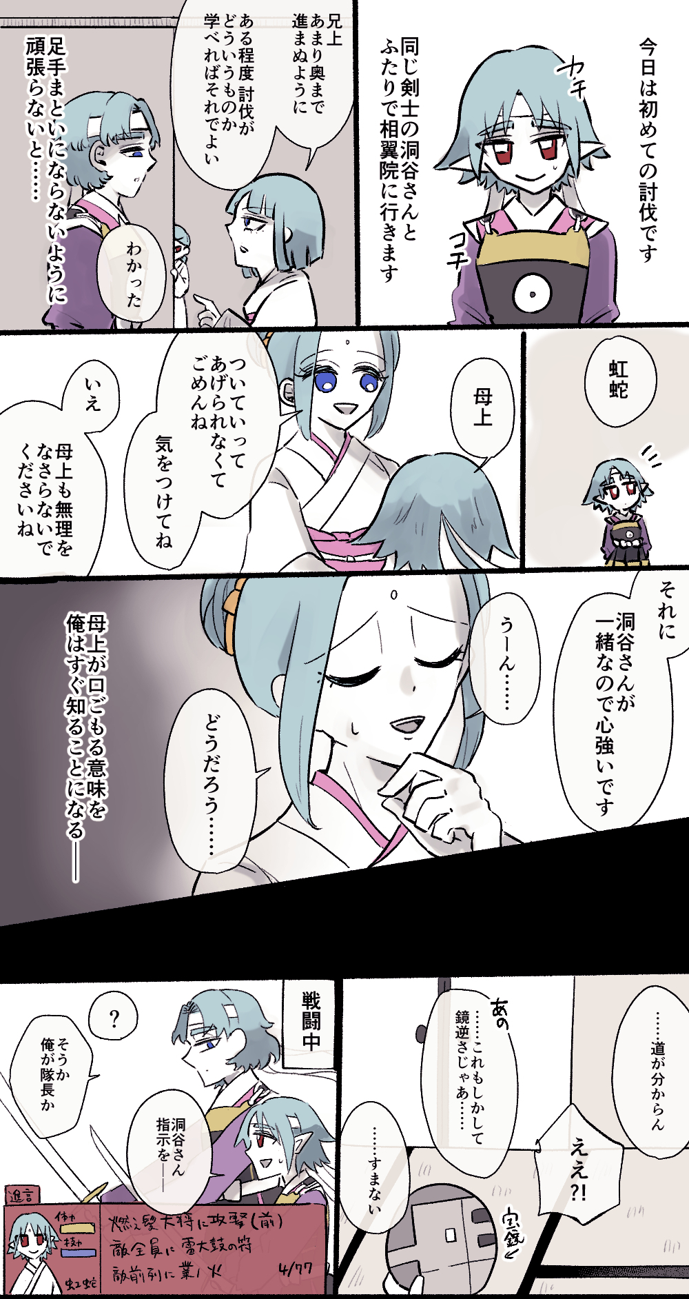 洞谷が隊長をやるのはこの時が最初で最後だったんですね~~勝手知ったる相翼院なんですが、なぜか右から進んでしまうし、太鼓持ちには全然合わないしでけっこうへっぽこ討伐だった記憶があります。のでそれを反映しております。この前にも洞谷はリクエの訓練失敗しているのでね。2人討伐も結局背中を見てろ感が強い