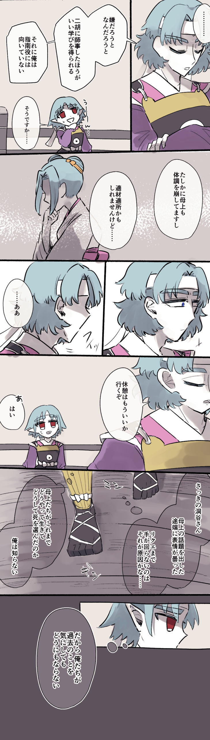 虹蛇はわりとドライというか冷静なタイプで、あんまり周りのじっとりした雰囲気にはのまれません。かといって乾燥剤のような存在というわけでもない(乾燥剤はどちらかというとイチイ)。感情のある補佐役みたいな……感じなのかな……