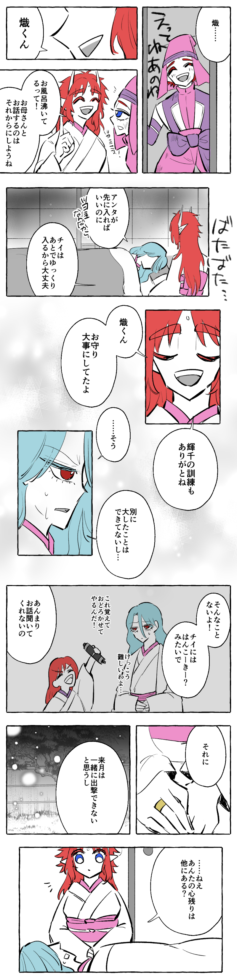 大江山越え後は子供が生まれたらすぐ引退……ともいかずギリギリまで戦ってもらったなあ。それでも熾くんと輝千にも訓練つけて、ずっとがんばってもらいっぱなしでした