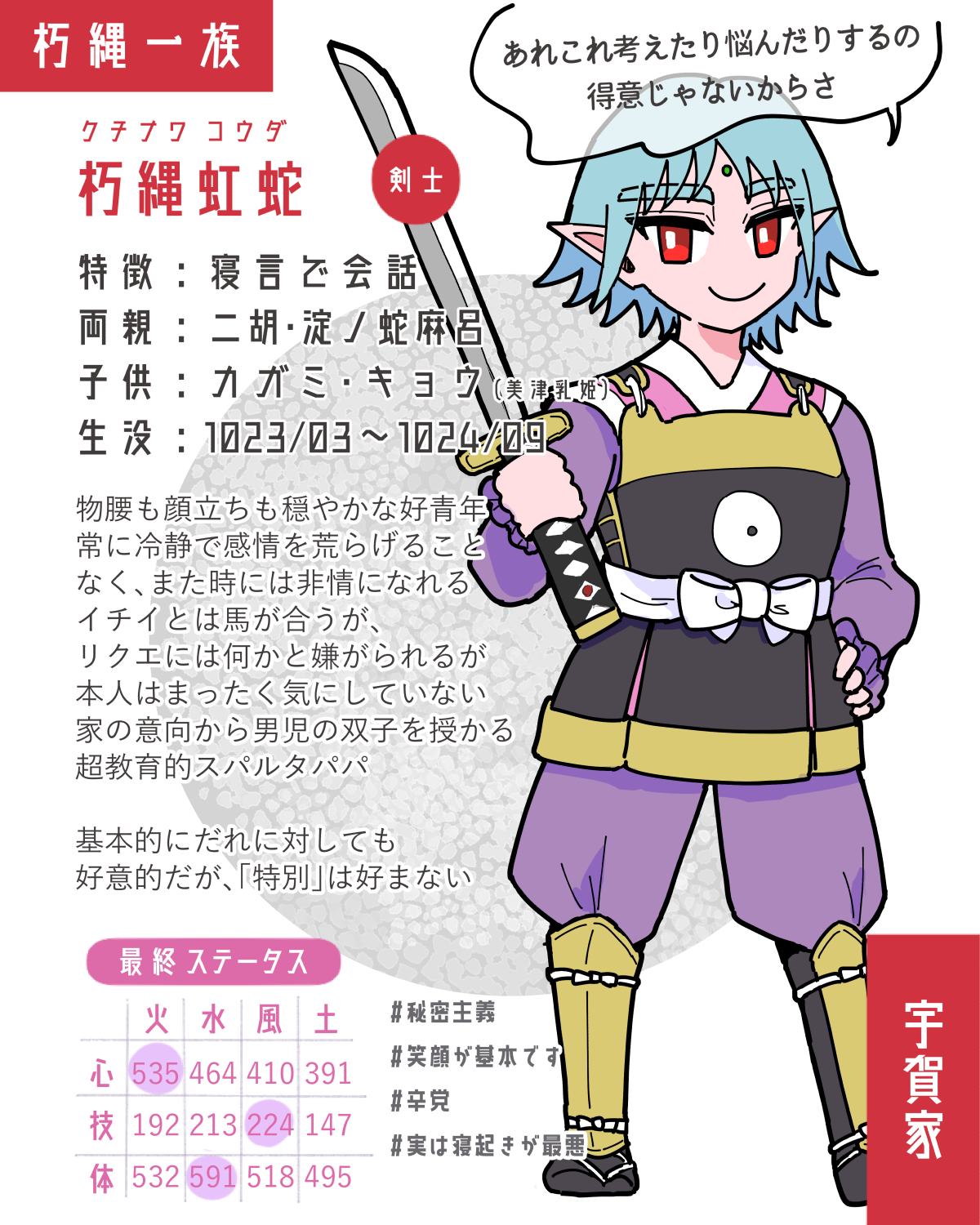 神経質。周りがおおらかなせいで余計にそれが目立つ。戦闘能力は随一だが、常にまだ足りないと考えている。呪いが解けることを心のどこかで期待していた。自分の存在価値や居場所に思い悩みがち。蛇は愚痴仲間