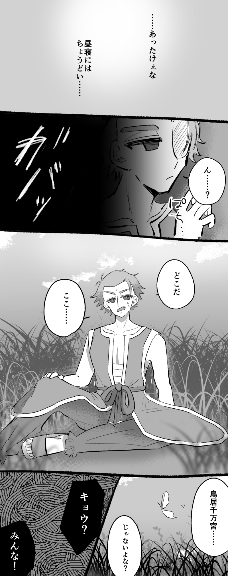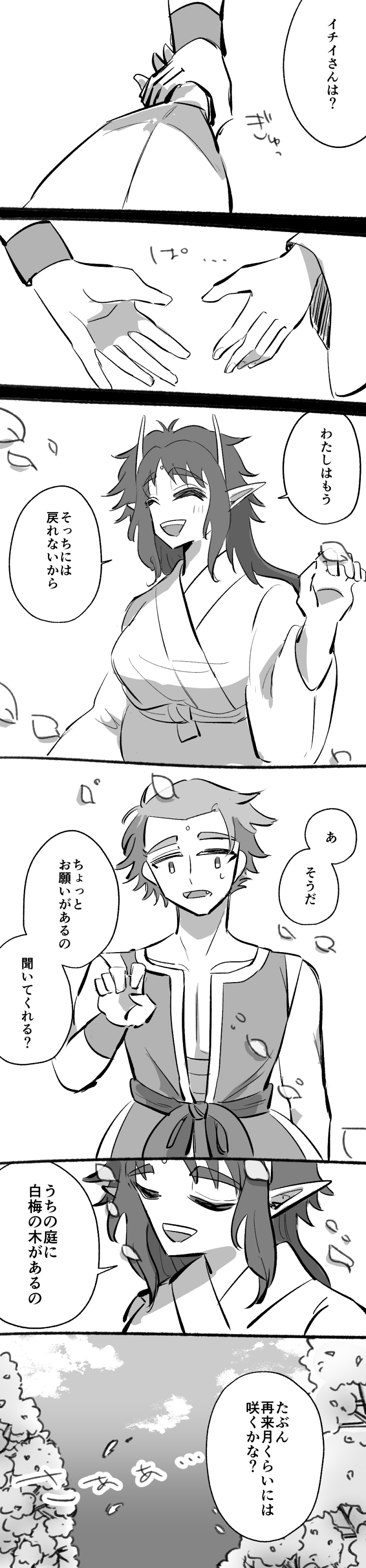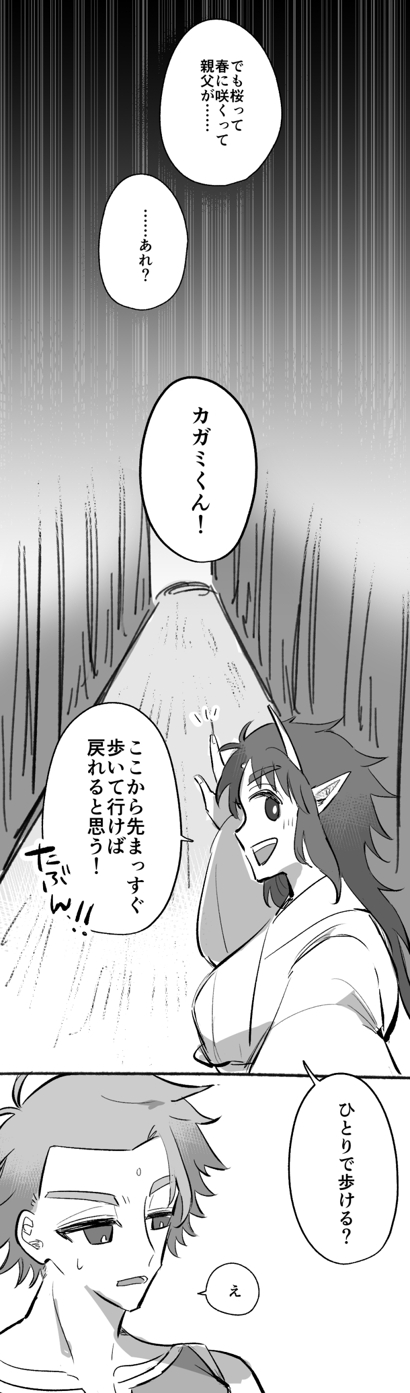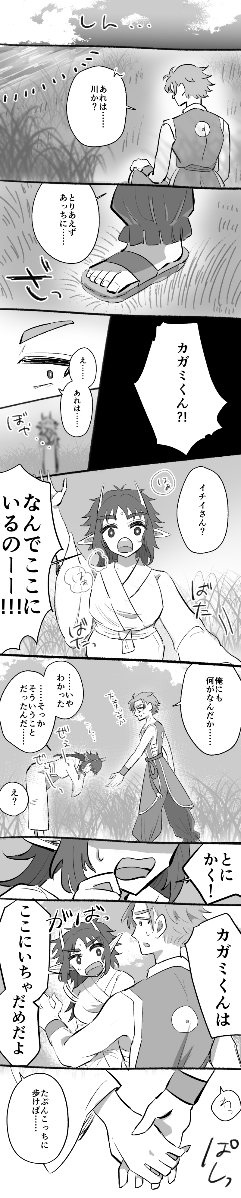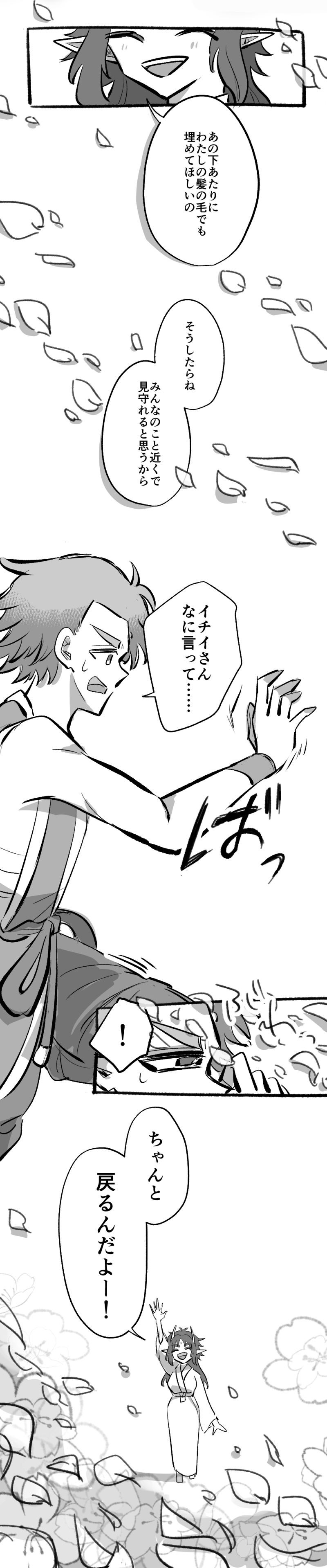 先月のことがあって「輝千にイチイの遺言聞く余裕なくない? そもそもイチイもこんな状況で遺言なんて言えなくない?」の話の延長で、じゃあイチイの遺言って誰が聞いたの?→カガミがあの世で聞いたんじゃない?という飛躍です。こんなことがあってもいいよね! ……ということでした。イチイはカガミの師匠なのでまったく繋がりがないというわけでもないですし