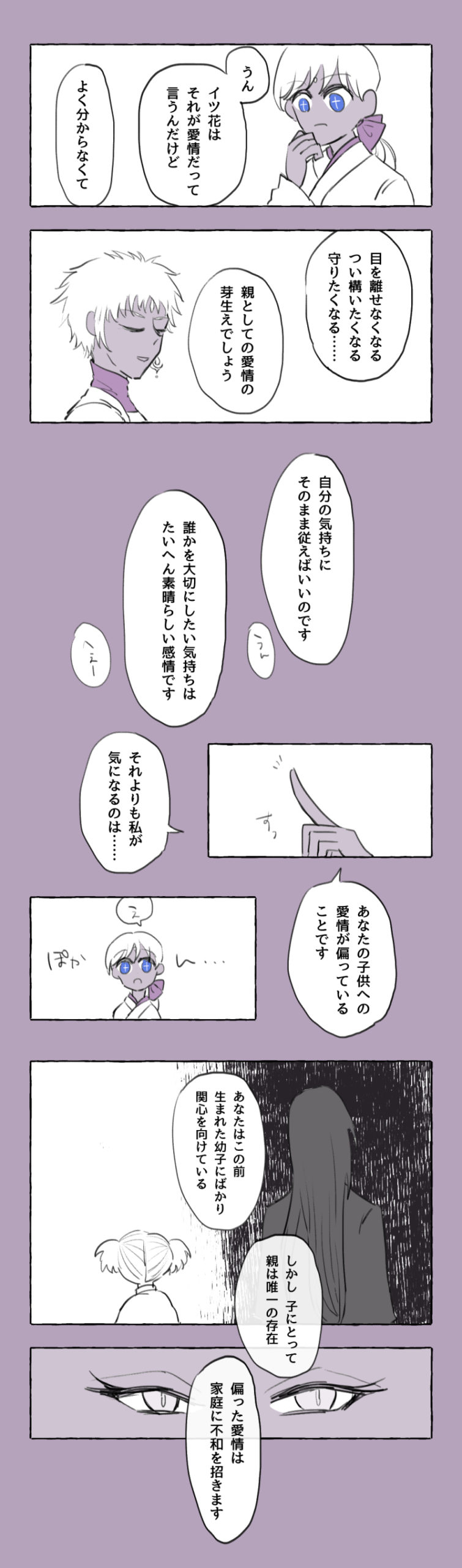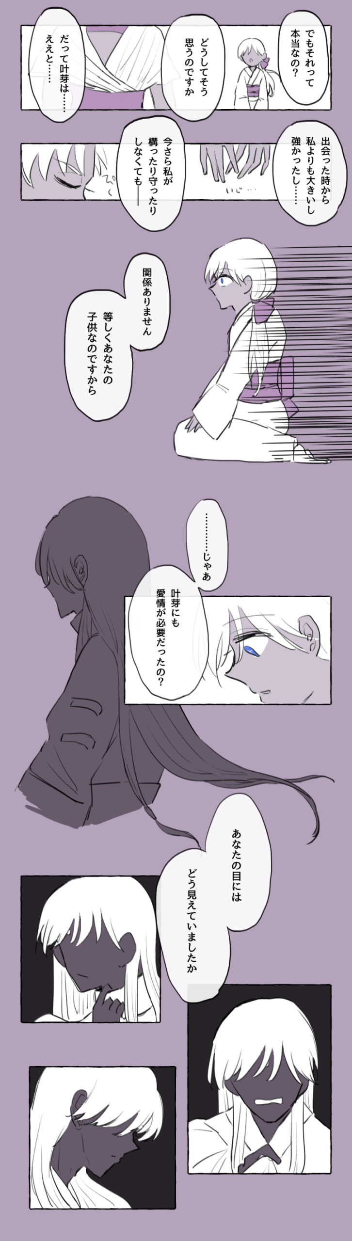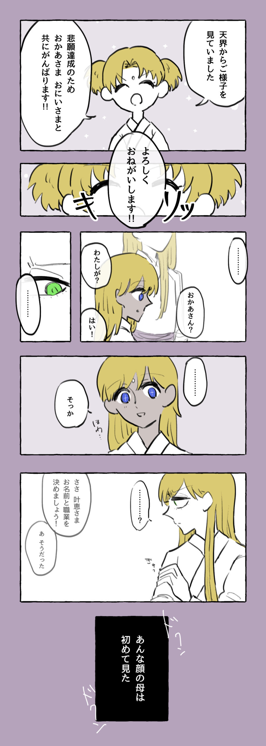 叶芽も叶芽で自分の感情を素直に吐露できないところがあるので(それも叶恵とのコミュニケーション不足なのですが)、自分を見てもらえない苛立ち全部を叶恵のせいにするのもまた違うンですよね~~。もう全部天界が悪い!!!!情操教育をしろ!!!!(反省して生まれたのが叶未)(蛇麻呂さんががんばって育てました)