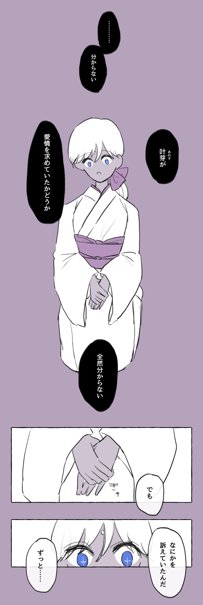 愛染院明丸さまに叶未に抱く感情が叶芽にも必要だったと教えられて、ようやく叶芽に目を向けるようになる。今まではやっぱり叶芽のことを見ていなかったので
